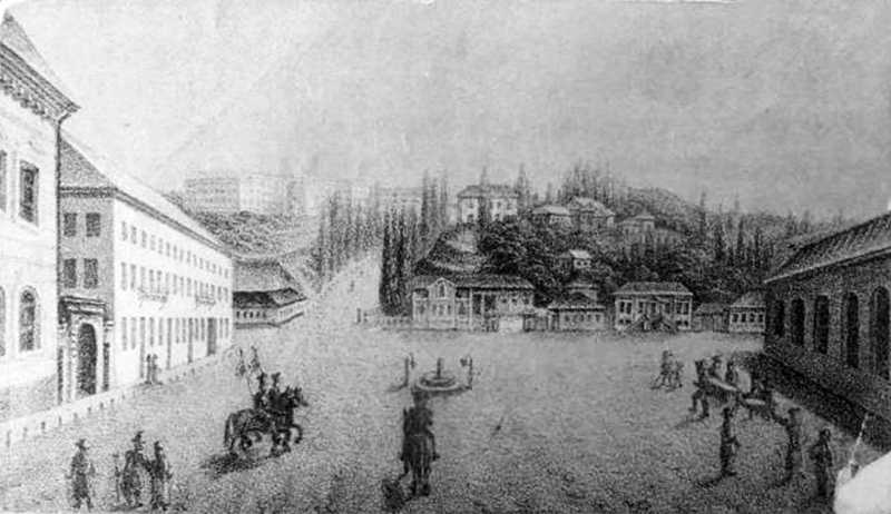 Коментар Ігоря Печерського: в глибині – перспектива Інстітутської (Бегичівської), а праворуч на Хрещатицькій площі ще стоїть пересильна тюрма. Також вже бачимо добудовану у 1851 р. будівлю Дворянського зібрання.