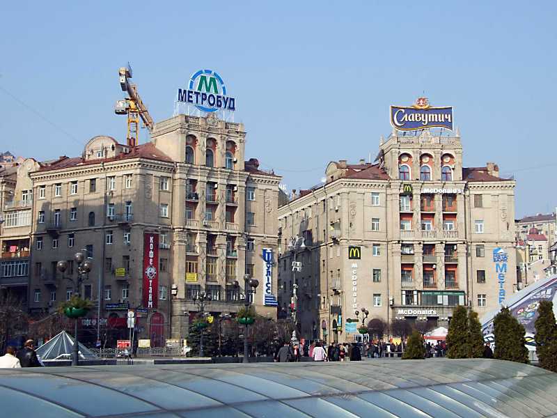2012 р. Західний бікРозмір зображення: 800:600 піксел Будинки по вул.Б.Грінченка 2 (ліворуч) та Софійській 2/1 (праворуч) орієнтовані головними фасадами на майдан Незахелжності. 19 березня 2012 р. Фото М.І.Жарких. |