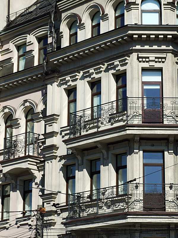 Фрагмент фасаду по вул. Житньоторзькій Розмір зображення: 600:800 піксел Фото М. І. Жарких, 16 березня 2020 р. Попередня сторінка | Вище | Наступна сторінка