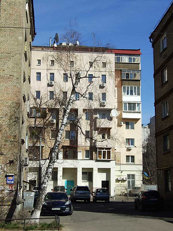 Вигляд з боку вул. Костянтинівської, у проміжок між будинками № 44 (ліворуч) та № 36 (праворуч). Фото М. І. Жарких, 16 березня 2020 р.