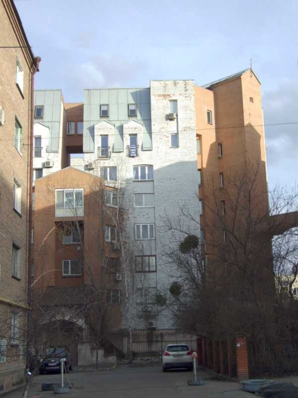 Житловий будинок (№ 10)Розмір зображення: 600:800 піксел Вигляд з північного заходу. Ліворуч – фрагмент будинку по вул. Костянтинівській, 63 / 12. Фото М. І. Жарких, 3 квітня 2021 р. |