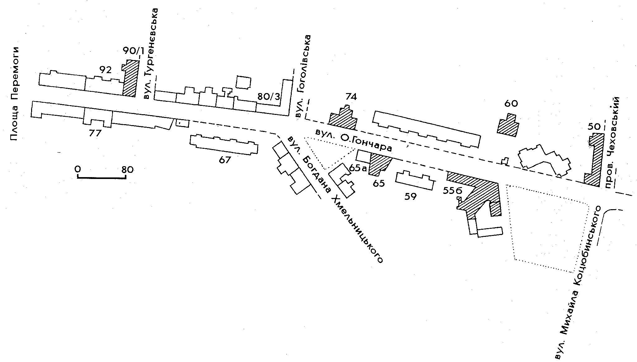 План забудови (55 – 77)Розмір зображення: 2046:1163 піксел Джерело: Звід пам’яток історії і культури України. – К.: 1999 р., т. 1 (Київ), с. 306. |