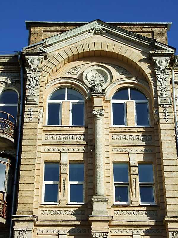 Фрагмент 4-5-го поверхів Розмір зображення: 600:800 піксел 2008 р. 25 червня. Фото М.І.Жарких. Вкладені елементи Рельєфна розетка Рельєфна пілястра