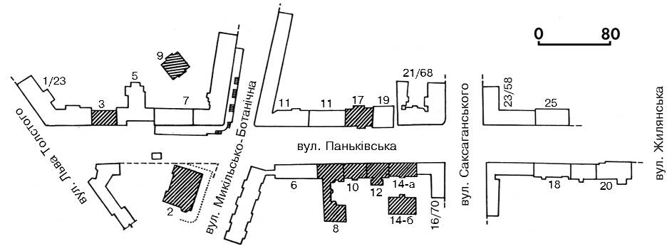 Значну кількість пам’яток історії втрачено. На розі вулиць Паньківської і Микільсько-Ботанічної розташовувався будинок, в якому 1863 винаймав помешкання історик, публіцист, громадський діяч М. Драгоманов. 1908–09 на його місці споруджено прибутковий будинок М. Грушевського. Крім домовласника з родиною, в ньому проживали архітектори і художники В. і Ф. Кричевські, тут же були й цінні мистецькі збірки М. Грушевського і В. Кричевського, що загинули під час обстрілу будинку більшовицькими військами у січні 1918. В будинку мешкали також історик мистецтва С. Гіляров, математик і механік, чл.-кор. Імператорської Санкт-Петербурзької АН В. Єрмаков, депутат 4-ї Державної думи, професор кафедри зоотехніки Київського політехнічного інституту С. Іванов, політичні діячі М. Корчинський і М. Порш, письменники і видавці Ю. Тищенко (Сірий) і С. Черкасенко, економіст Л. Яснопольський.