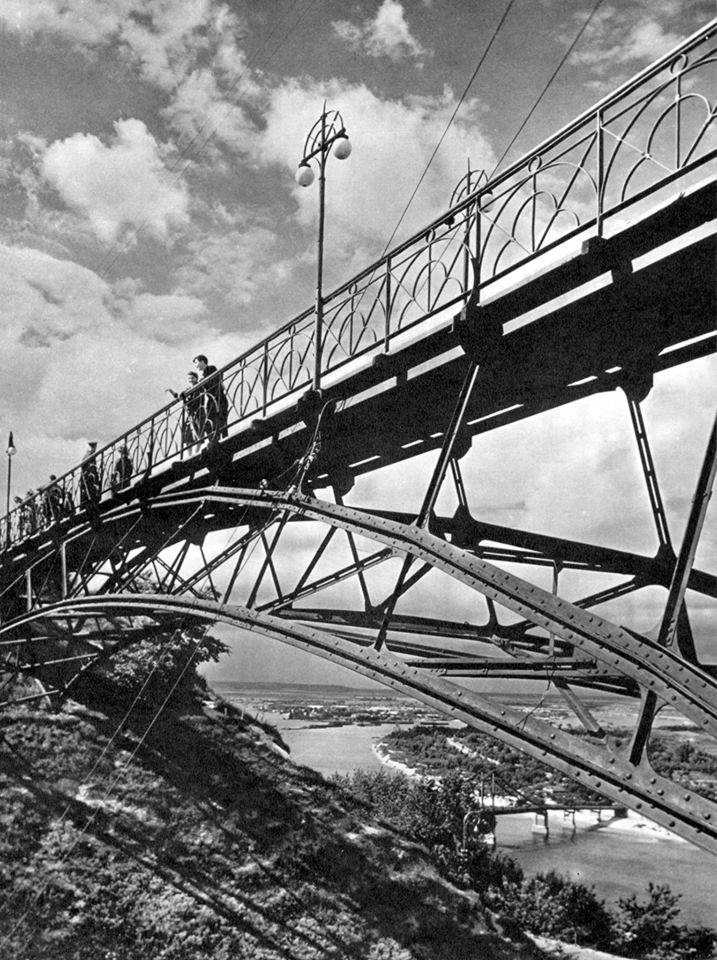 Міст збудовано в 1909 – 1910 рр. за проектом Є. О. Патона. Він з’єднує Хрещатий парк на півночі й Міський сад на півдні. Після завершення будівництва моста ґрунт під ним було вийнято і утворилась сучасна Петрівська алея (кол. вулиця Петра Великого).