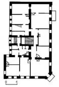 Триповерховий з підвалом, цегляний, тинькований, у плані Г-подібний. Перекриття пласкі, у підвалі склепінчасті.