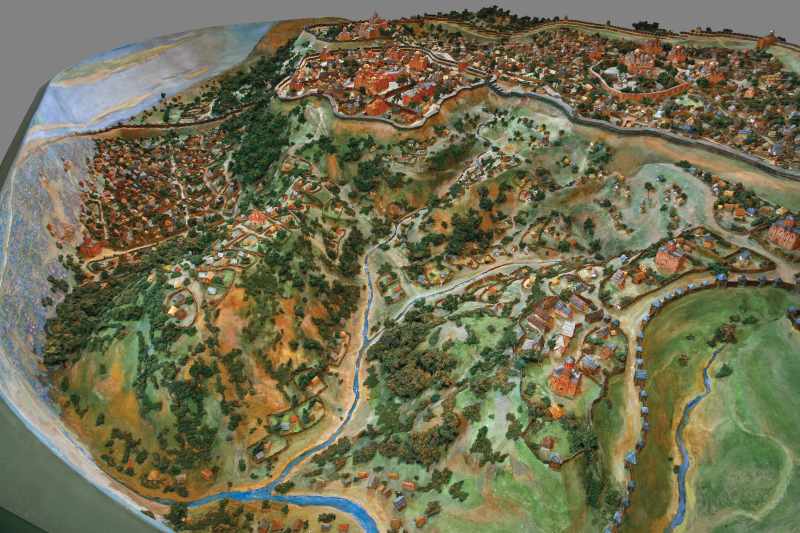 На передньому плані – смужка річки Глибочиці, в яку впадає Кожум’яцький струмок. Праворуч від струмка – відроги Копиревого кінця, ліворуч – Замкова гора. В верхній частині кадра (зліва направо): Поділ, город Володимира, частина города Ярослава.