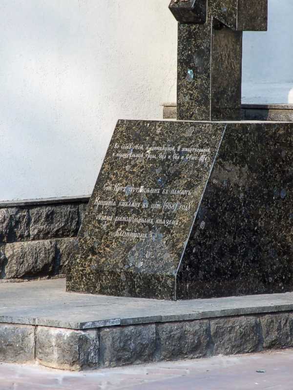 Напис (імітація церковнослов’янської мови): «Во славу святой и единосущной и животворящей и нераздельной троицы отца и сына и святого духа. Сей крест установлен в память крещени киевсля в ЦПИ (988) году святым равноапостольным князе Владимиром».
