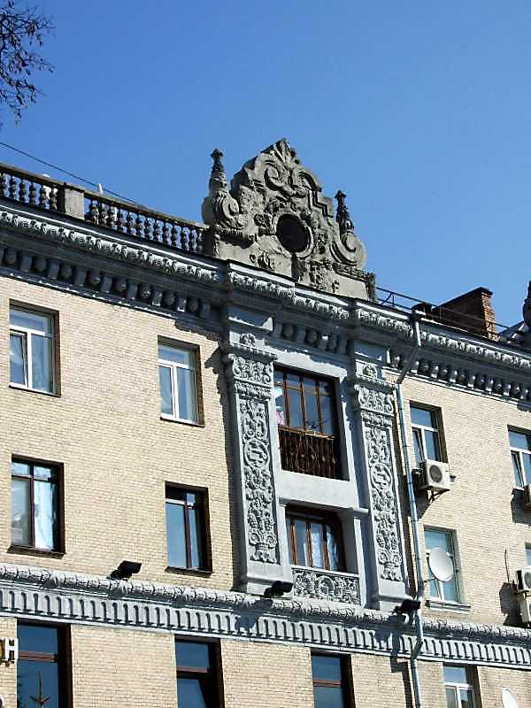 Фрагмент головного фасаду Розмір зображення: 600:800 піксел 3 квітня 2009 р. Фото М.І.Жарких. Вкладені елементи Фронтон Рельєфне обрамлення вікон