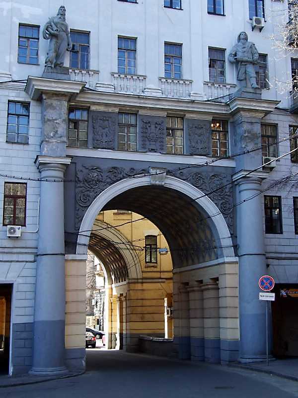 Арка проїзду Розмір зображення: 600:800 піксел 3 квітня 2009 р. Фото М.І.Жарких. Вкладені елементи Робітниця Робітник Рельєфна вставка Рельєфна вставка