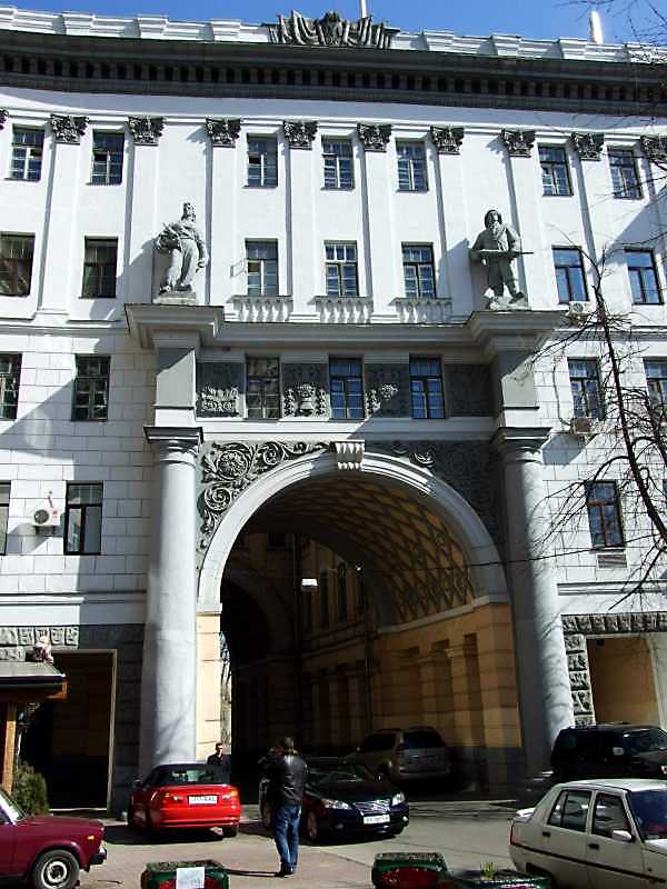 2009 р. Центральна частина головного фасаду Розмір зображення: 600:800 піксел 3 квітня 2009 р. Фото М.І.Жарких. Вкладені елементи Фронтон Робітниця Робітник Рельєфна вставка