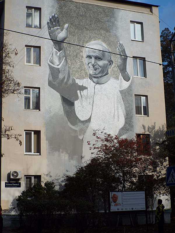 Портрет папи Іоана-Павла 2-гоРозмір зображення: 600:800 піксел Фото Івана Парнікози, 22 жовтня 2017 р. Портрет відкрито 15 жовтня 2017 р. . Він нанечений на торцевий фасад будинку, зверненийдо вул. іоана-Павла 2-го. |