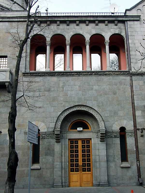 2009 р. Центральна частина фасаду Розмір зображення: 600:800 піксел 6 квітня 2009 р. Фото М.І.Жарких. Вкладені елементи Лоджія 2-го поверху (+) Портал Вікно 1-го поверху