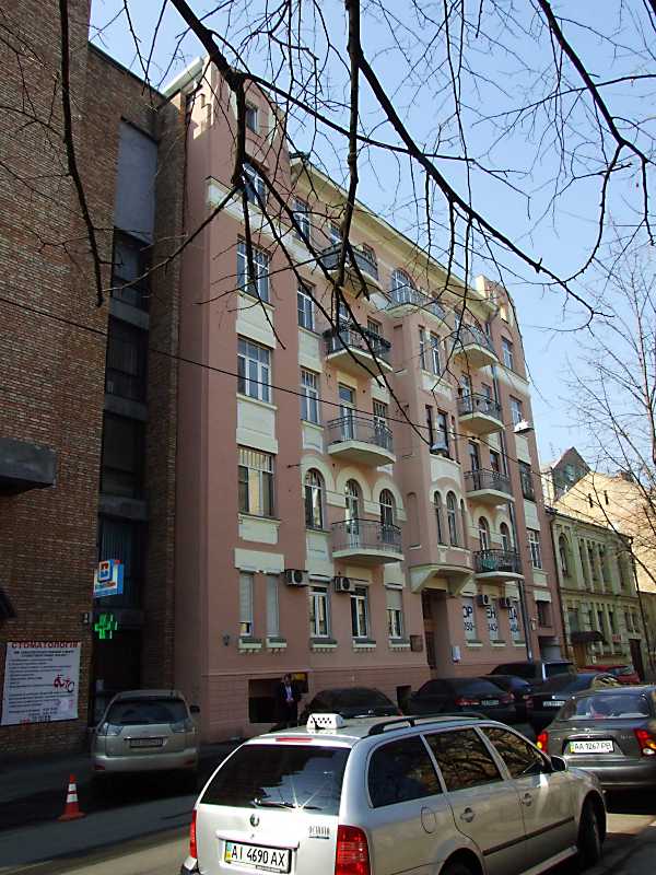 Житловий будинок (№ 17) Розмір зображення: 600:800 піксел 19 березня 2012 р. Фото М.І.Жарких. Вкладені елементи 2003 р. Звід пам’яток Києва (+) 2012 р. Головний фасад (+) 2012 р. Ліва частина головного фасаду 2012 р. Права частина головного фасаду 2012 р. Загальний вигляд з півночі