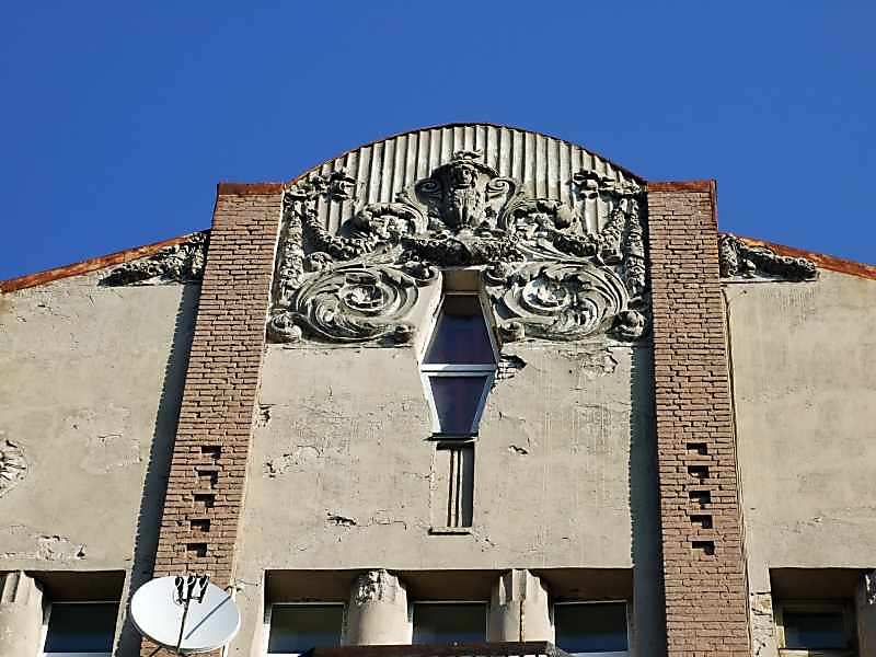 Фронтон головного фасаду Розмір зображення: 800:600 піксел 29 жовтня 2007 р. Фото М.І.Жарких. Вкладені елементи [2] Рельєфний декор