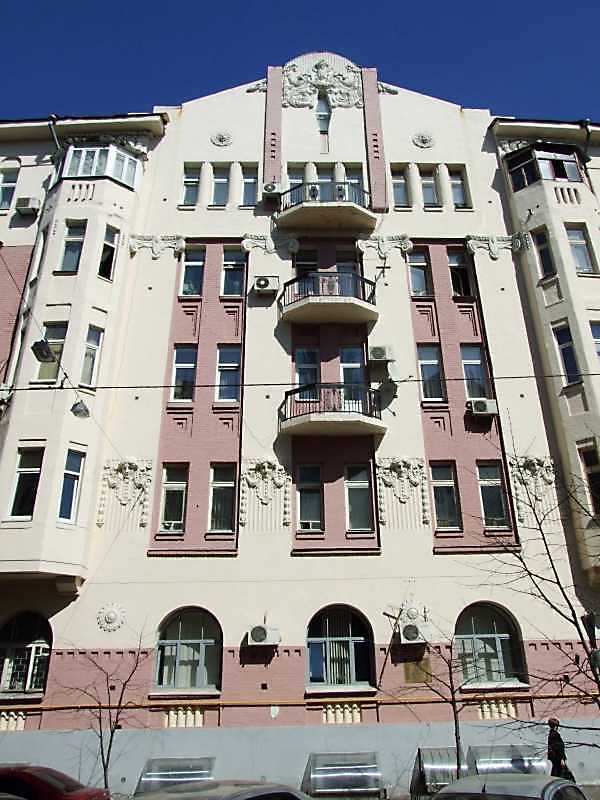 2009 р. Центральна частина головного фасаду Розмір зображення: 600:800 піксел 8 квітня 2009 р. Фото М.І.Жарких. Вкладені елементи Фрагмент 5-го поверху і фронтон (+) Капітель на рівні 4-го поверху Плачуча удова на рівні 2-го поверху