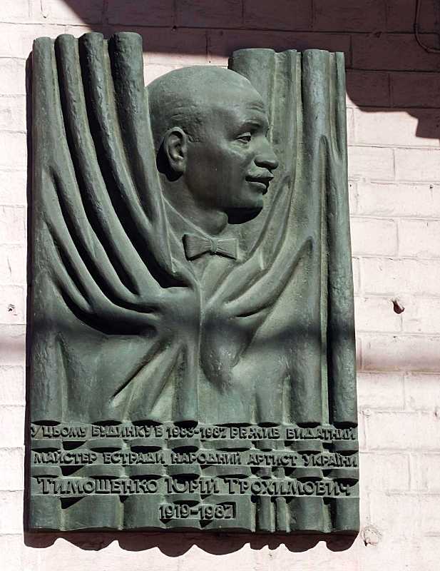 Напис: «У цьому будинку в 1983 – 1987 рр. жив видатний майстер естради, народний артист України Тимошенко Юрій Трохимович (1919 – 1987)».