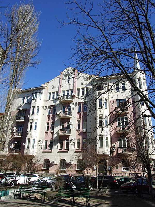 2020 р. Фасад по вул. Рейтарській Розмір зображення: 600:800 піксел Фото М. І. Жарких, 16 березня 2020 р. Вкладені елементи Фронтон і вікна 5-го поверху (+) Капітель 4-го поверху Сецесійний маскарон 2-го поверху