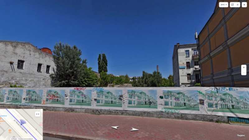2015 р. Порожнє місцеРозмір зображення: 800:450 піксел Фото 2015 р. з панорам Яндекс Але на паркані нарисовано зовсім не той будинок, який тут споруджено! |