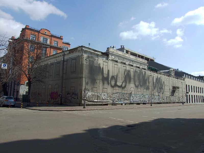 2021 р. Загальний вигляд із заходуРозмір зображення: 800:600 піксел Ліворуч – вул. Борисоглібська, праворуч – вул. Сагайдачного. Фото М. І. Жарких, 21 березня 2021 р. Уже на панорамі Яндеркса 2015 р. бачимо фасад, затягнений оцим полотном. |