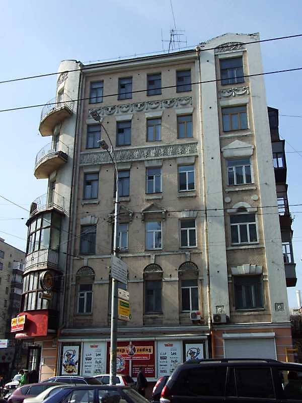 2009 р. Фасад по вул. Саксаганського Розмір зображення: 600:800 піксел 7 квітня 2009 р. Фото М.І.Жарких. Вкладені елементи Вікно 6-го поверху Букраній між 5 і 6 поверхами Пальмети між 4 і 5 поверхами Вікна 2-го поверху