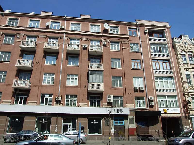 2009 р. Фасад по вул. Саксаганського Розмір зображення: 800:600 піксел 7 квітня 2009 р. Фото М.І.Жарких. Вкладені елементи Меморіальна дошка В.О.Брау Меморіальна дошка Д.П.Демуцькому