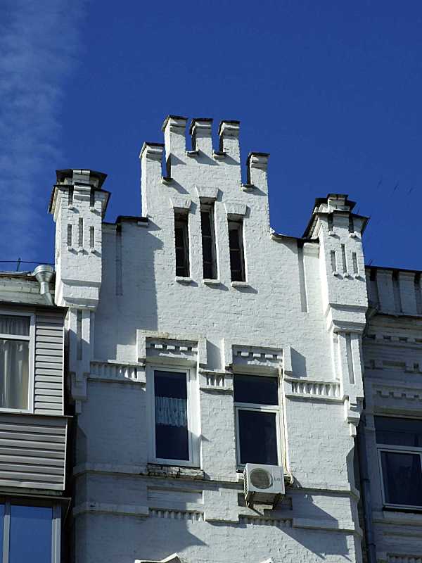 Вікна 6-го поверху і правий фронтон Розмір зображення: 600:800 піксел Фото М. І. Жарких, 13 березня 2020 р. Попередня сторінка | Вище | Наступна сторінка