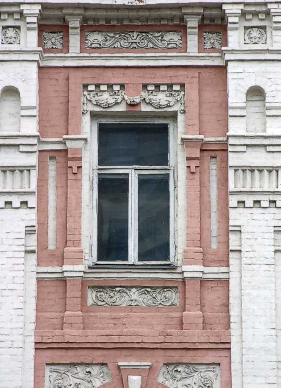 Вікно 3-го поверху Розмір зображення: 580:800 піксел Фото М. І. Жарких, 29 березня 2021 р. Вкладені елементи Фриз над вікном 3-го поверху
