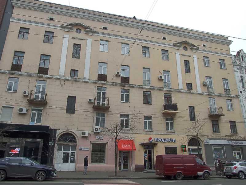 2021 р. Головний фасад Розмір зображення: 800:600 піксел Фото М. І. Жарких, 29 березня 2021 р. Вкладені елементи Вікно 4-го поверху з фігурною граткою