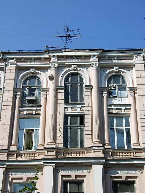 Центральна частина головного фасаду Розмір зображення: 600:800 піксел 2008 р. 12 червня. Фото М.І.Жарких. Попередня сторінка | Вище | Наступна сторінка