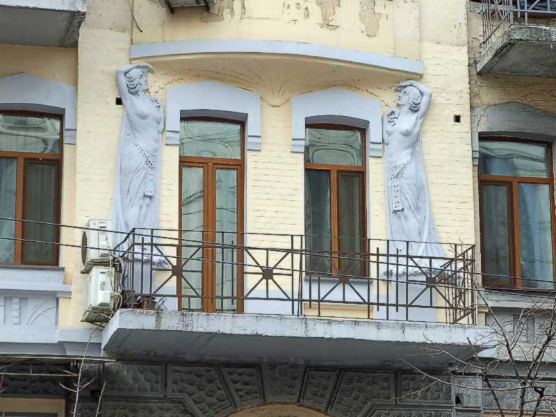 Балкон 3-го поверху Розмір зображення: 800:600 піксел Фото М. І. Жарких, 29 березня 2021 р. Вкладені елементи Лівий рельєф жінки