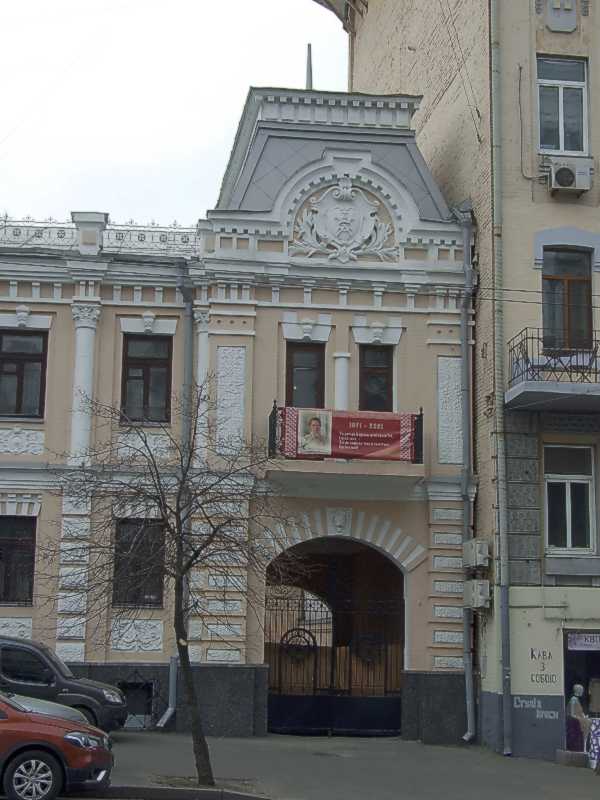 Права частина головного фасаду Розмір зображення: 600:800 піксел Фото М. І. Жарких, 29 березня 2021 р. Вкладені елементи Герб на фронтоні