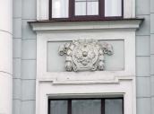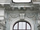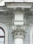 Вікна 2-3-го поверхів Розмір зображення: 582:800 піксел Фото М. І. Жарких, 29 березня 2021 р. Вкладені елементи Корінфська капітель півколони Тимпан вікна 3-го поверху Рельєф між вікнами 3-го та 2-го поверхів