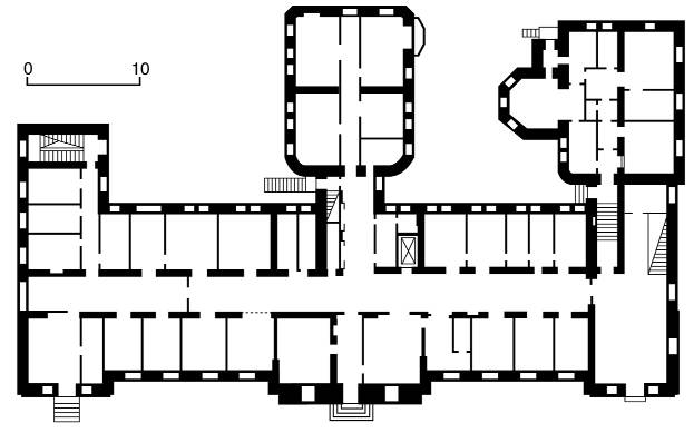 [2003 р.] План першого поверху головного будинкуРозмір зображення: 623:389 піксел Джерело: Звід пам’яток історії і культури України. – К.: 2003 р., т. 2 (Київ), № 486-68a. |