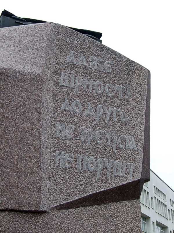 Напис 1Розмір зображення: 600:800 піксел Фото М. І. Жарких, 31 березня 2021 р. Напис: «Адже вірності до друга / Не зречуя, не порушу». |