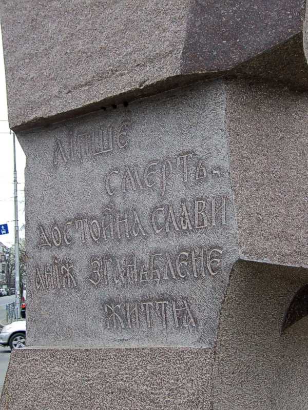 НаписРозмір зображення: 600:800 піксел Фото М. І. Жарких, 31 березня 2021 р. Напис: «Ліпше смерть, достойна слави, / Аніж зганьблене життя». |