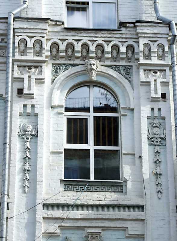 Вікно 3-го поверху сходової клітки Розмір зображення: 587:800 піксел Фото М. І. Жарких, 3 квітня 2021 р. Вкладені елементи Тимпан вікна 3-го поверху Рельєф на пілястрі (3-й поверх)