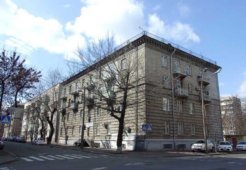 Житловий будинок (№ 45)Розмір зображення: 800:554 піксел Вигляд зі сходу. Ліворуч – вул. Щекавицька, праворуч – вул. Почайнинська. Фото М. І. Жарких, 24 березня 2021 р. |