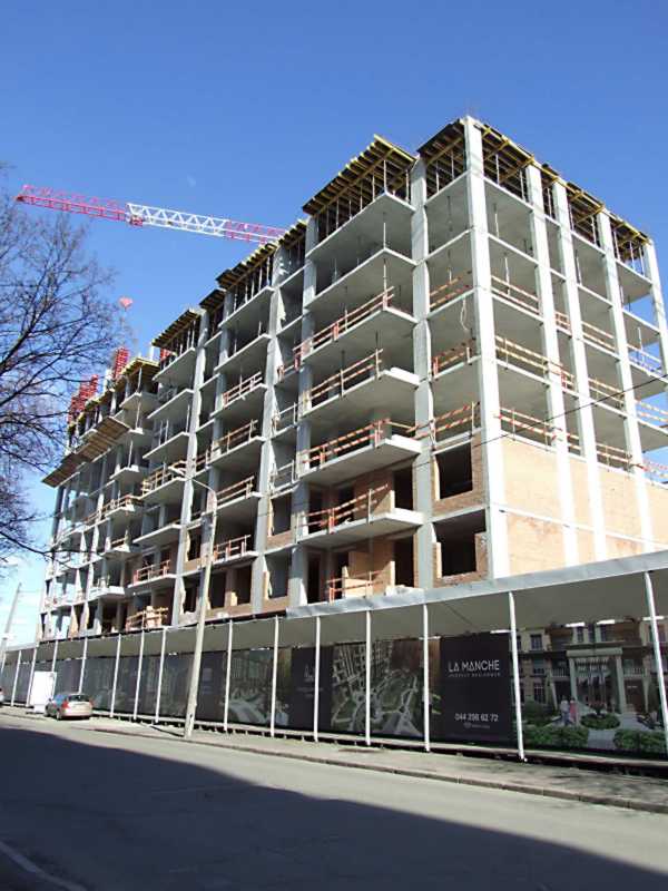 Житловий комплекс «Lamanche» (№ 46)Розмір зображення: 600:800 піксел Вигляд із заходу, з боку вул. Щекавицької. Фото М. І. Жарких, 3 квітня 2021 р. |