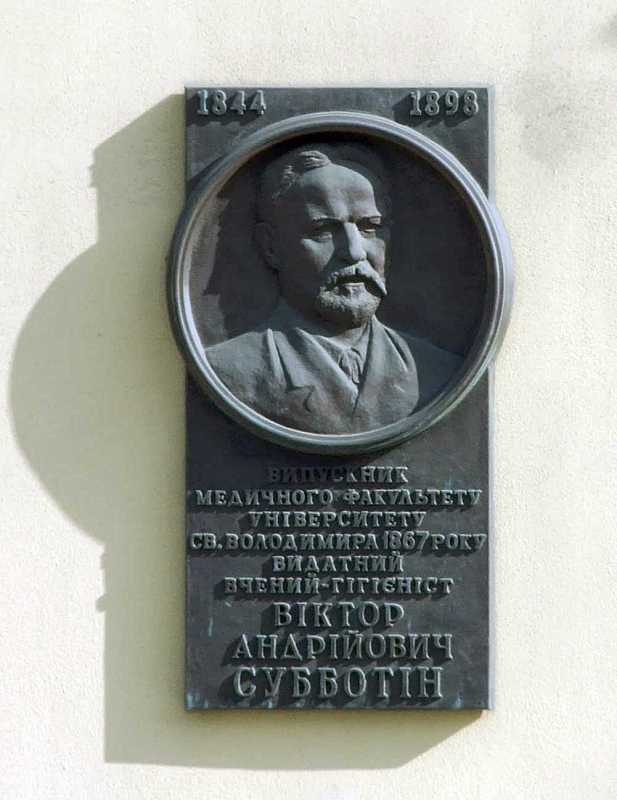 На дошці напис: «1844 – 1898 Випускник медичного факультету університету св. Володимира 1867 р., видатний вчений-гігієніст Віктор Андрійович Субботін».
