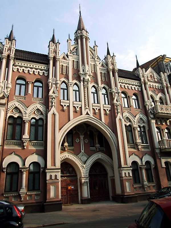 2009 р. Центральна частина головного фасаду Розмір зображення: 600:800 піксел 6 квітня 2009 р. Фото М.І.Жарких. Вкладені елементи 3-й поверх і фронтон (+) Портал (+)