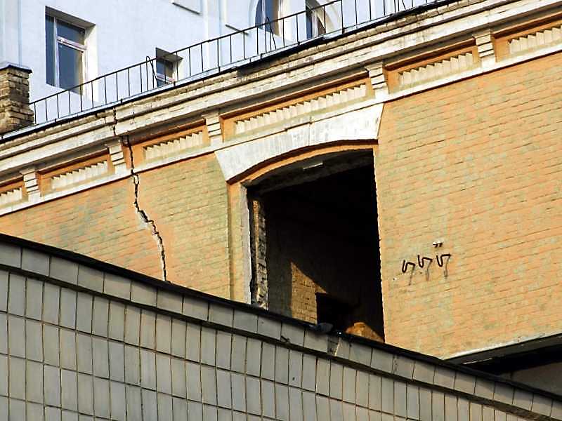 Фрагмент бічного фасаду із загрозливою тріщиноюРозмір зображення: 800:600 піксел 6 квітня 2009 р. Фото М.І.Жарких. |