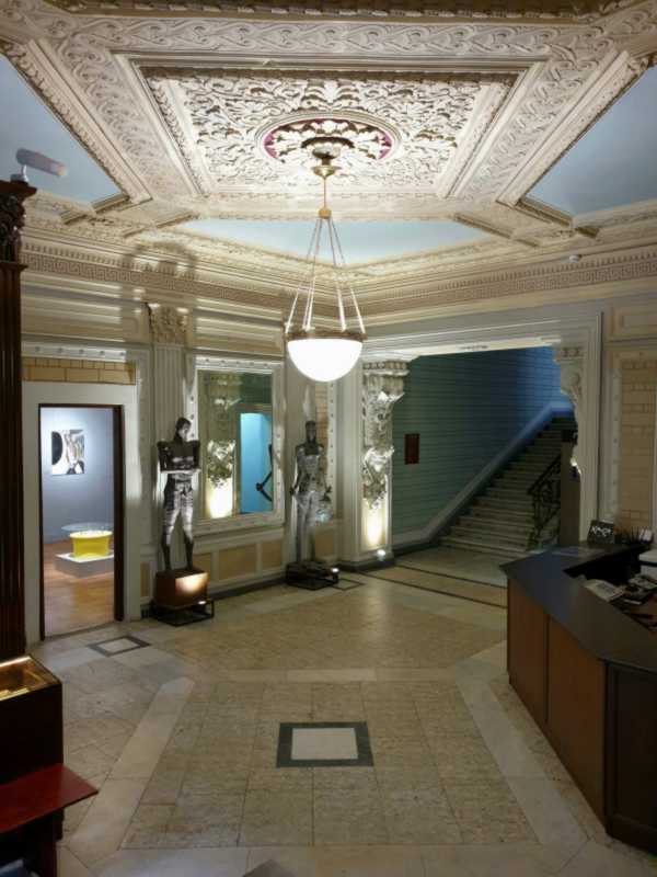Зведений у 1901 році особняк Семена Могилевцева мав раціоналістичне планування та відповідно до тогочасної моди поділявся на парадну, ділову та приватну частини. Парадні зали традиційно розміщені на другому поверсі, і більшість з них збереглися в автентичному вигляді. Частину першого поверху по центральній осі будинку займають парадний вхід із дерев’яним тамбуром, вестибюль та парадні мармурові сходи. Тут зберіглося оригінальне оздоблення стін та стелі у неокласичному стилі, скульптурна група із зображенням жезла бога Меркурія, покровителя торгівлі, парних маскаронів Аполлона та Діоніса, а також перевернутого «рогу достатку» — символу богині Фортуни.