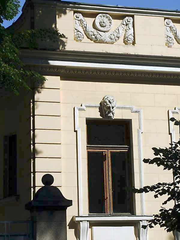 2008 р. Фрагмент головного фасаду Розмір зображення: 600:800 піксел 2008 р. 27 червня. Фото М.І.Жарких. Вкладені елементи Рельєфна вставка Маскарон