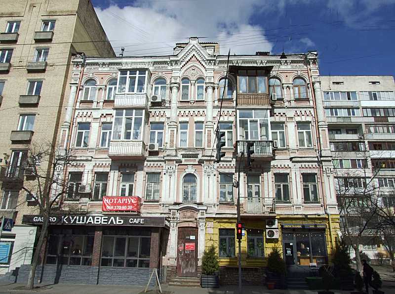 2020 р. Головний фасад Розмір зображення: 800:595 піксел Фото М. І. Жарких, 15 березня 2020 р. Вкладені елементи Вікна 4-го поверху сходової клітки Вікна 4-го поверху Вікна 3-го поверху Вікна 2-го поверху Вхід
