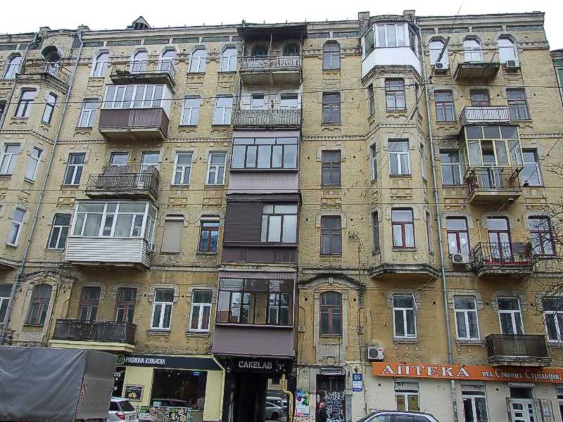 2021 р. Головний фасад Розмір зображення: 800:600 піксел Фото М. І. Жарких, 17 березня 2021 р. Вкладені елементи Еркер 5-го поверху Вікно 2-го поверху