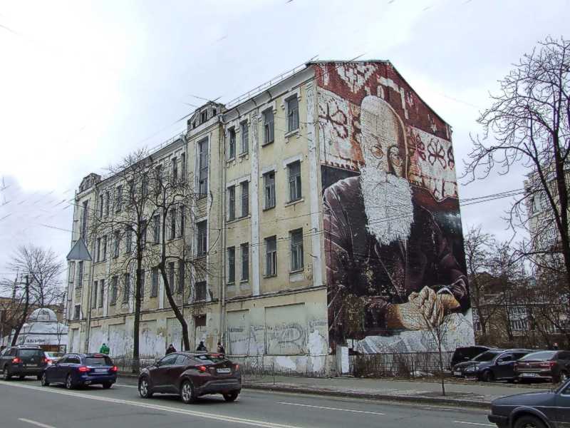 На брандмауері – портрет М. С. Грушевського. Фото М. І. Жарких, 17 березня 2021 р.