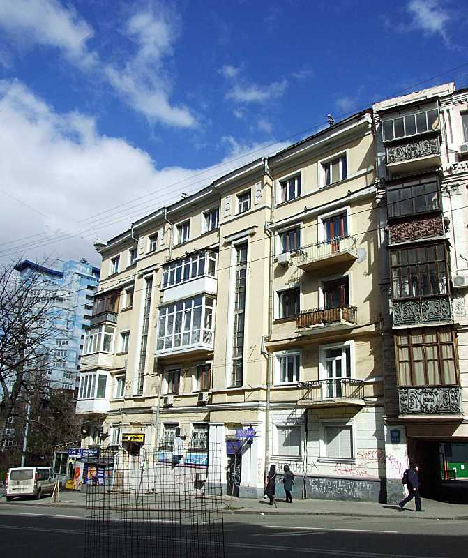 Житловий будинок (№ 76) Розмір зображення: 671:800 піксел Фото М. І. Жарких, 15 березня 2020 р. Вкладені елементи 1999 р. Звід пам’яток Києва (+) 2020 р. Загальний вигляд з півдня (+) 2020 р. Загальний вигляд із заходу