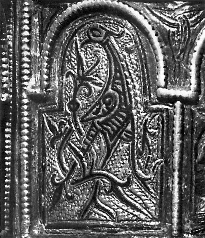 Браслет из клада, найденного в 1893 году в Киеве (с изображением на створке птицы и растения). Деталь сильно увеличена.