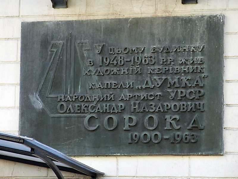 В 1948 – 1963 рр. в цьому будинку жив О.Н.Сорока – хоровий диригент, нар. артист УРСР; меморіальна дошка 1970 р. [Памятники истории и культуры Украинской ССР. – К.: 1987 г., с. 38].